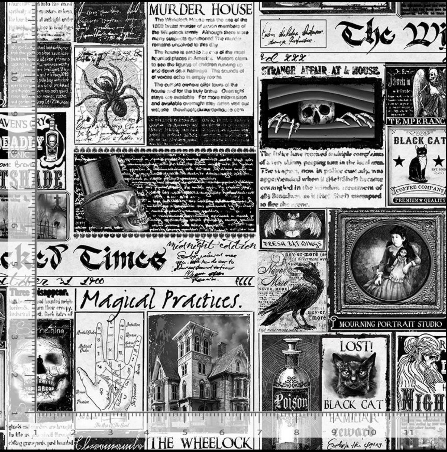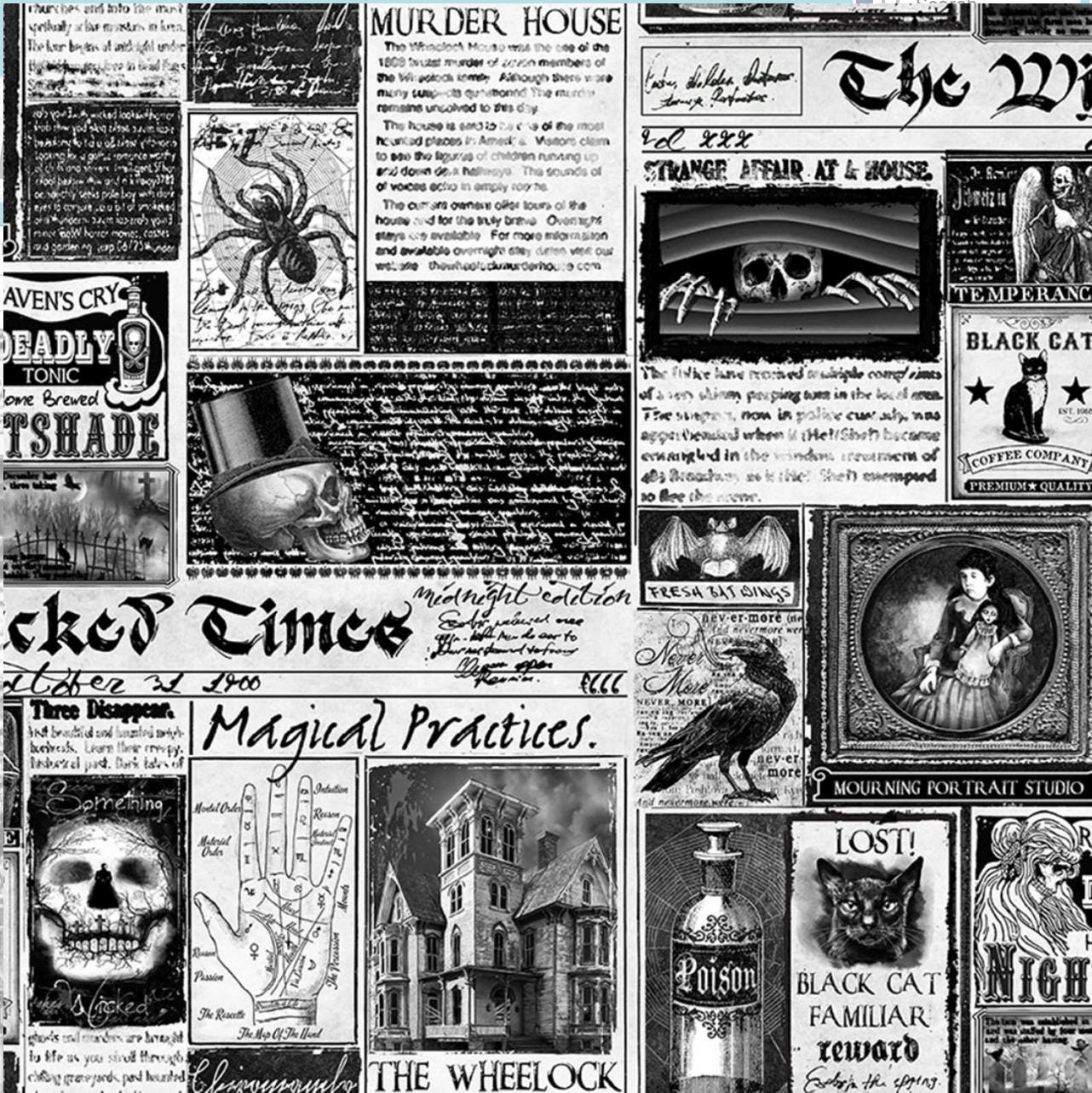 White Wicked Time Newspaper Halloween Fabric -Half Yard Cut from Wicked Collection for Timeless Treasures Fabrics. 100% premium cotton. Sold in 1/2 yard increments. Multiple quantities will be cut in a continuous piece.