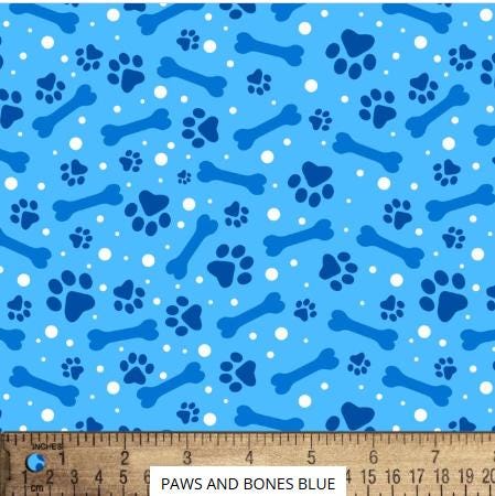 Blue Paws & Dog Bones Fabric- Half Yard Cut by David Textiles Fabric. 100% premium cotton fabric Sold in 1/2 yard increments. Multiple quantities will be cut in a continuous piece.