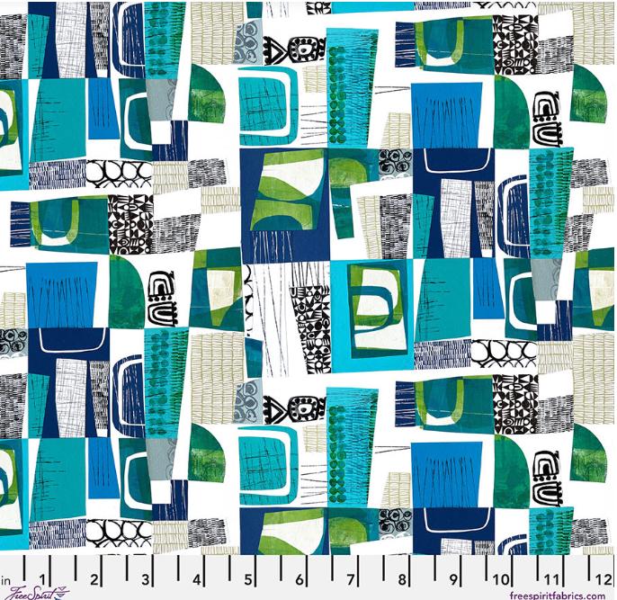 Flying South Sea Blue Collage Fabric - Half Yard Cut from Flying South Collection by Clare Youngs for Free Spirit Fabrics. This vibrant fabric features a dynamic collage design with a mix of geometric shapes and abstract patterns in shades of sea blue, teal, green, and white. The design is both modern and artistic, offering a unique aesthetic. 100% premium cotton fabric Sold in 1/2 yard increments. Multiple quantities will be cut in a continuous piece.